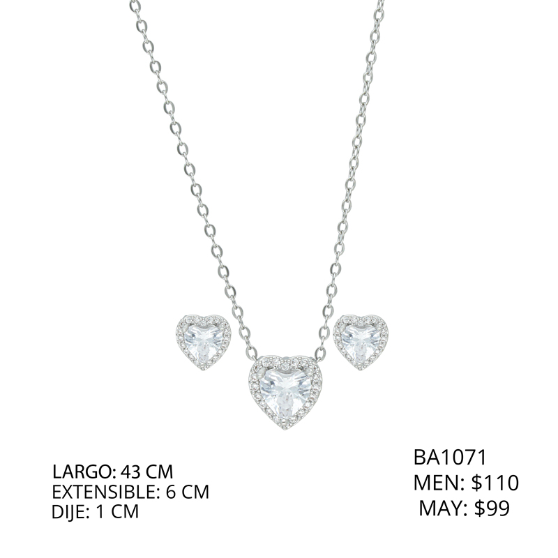 Juego Plateado Corazon Piedras Chapa de Oro y Acero BA1071